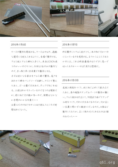 弊サークルの過去の本はテキストが多いのですが、今回はあえて写真や図を多めにしています。したがって技術系のキーワードも(主に紙面の都合上)少なめになっています。 全体的に、「電子回路についてこれこれこういう部品を使ってこういう回路で・・・」というのよりは、 「ケーブルなしで動かすのに電池を入れる」とか「アルミケースをつくるのにアルミ板とアルミ棒を使う」とか、 設計のアイディアに対してどう作業したかを説明する内容が多くなっています。