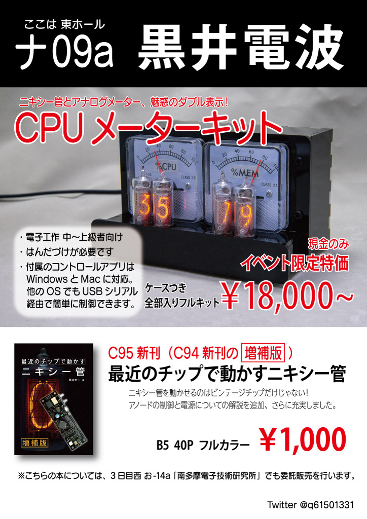 キットは夏にも頒布しましたニキシー管CPUメーターですが、今回はイベント限定バージョンをお出しします。コストやニキシー管の入手性から、委託販売に出せないバージョンです。通常版を含めて3種類ありますので、お好きなものをどうぞ。いずれも、秋葉原の委託販売よりお安くお求めになれます。