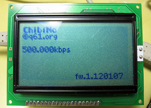 正しくアップロードでき、ちびモ本体が正しく組み立てられていれば、左の写真のように、LCD にちびモの初期化画面が現れます。