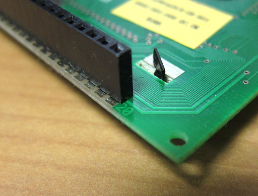 特に、LCD モジュールはピンが 1 列に並んでいて、逆にしてもつながってしまうので、注意してください。よく見ると、下の写真のように、どちらが1番ピンか、もしくは 20 番ピンか、小さく書いてあります。