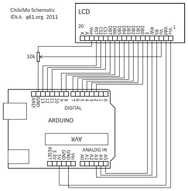 - 128ドット×64ドット の白黒液晶ディスプレイモジュールで、「KS0108 互換」の20ピンのものならならなんでも OK です。たくさんの種類のものが市販されていますが、ここでは秋月電子の P-02159 をおすすめします。入手しやすく、また工作も簡単です。これもコネクタ以外は完成した状態で売っているので、はんだづけはちょっとだけです。