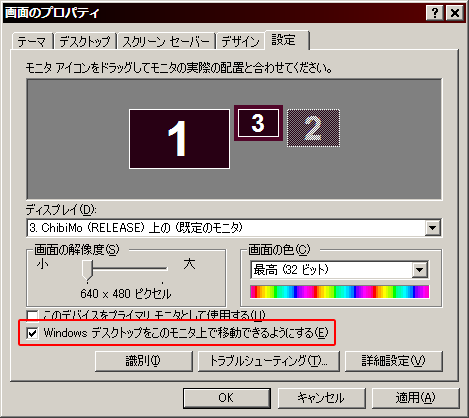 ここまでで、ちびモは通常の外部ディスプレイとして PC に認識されています。インストール直後はオフになっていますので、画面のプロパティを使ってオンにします。