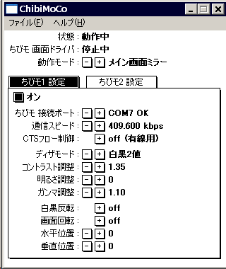 - ソフトウエアを新版に入れ換えました。ちびモを2台まで同時にコントロールできるようになりました。また、Windows 7 でも画面ミラーにて動作させることができるようになりました。