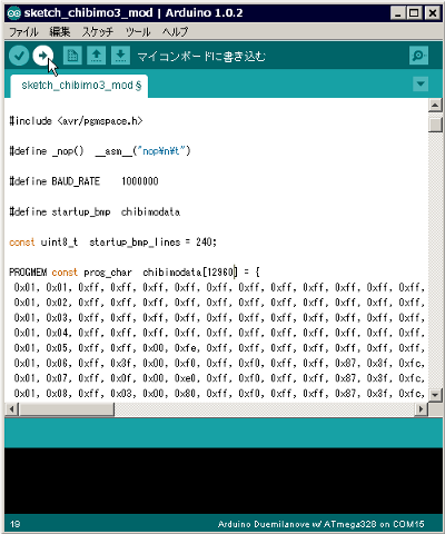 このデータを、ちびモのArduinoスケッチに混ぜ込みます。