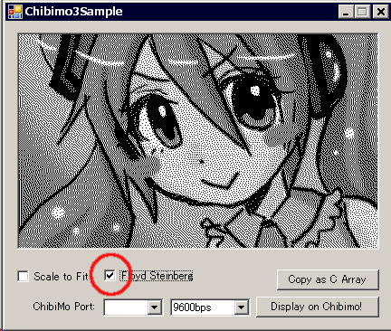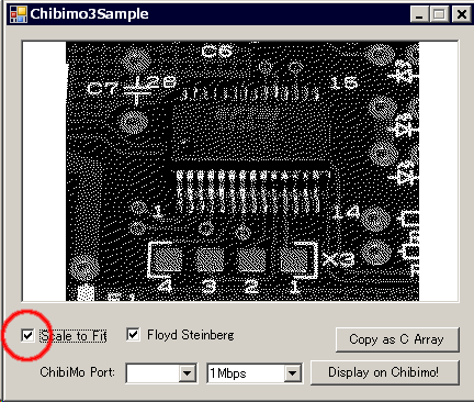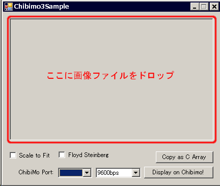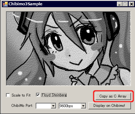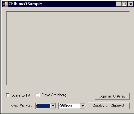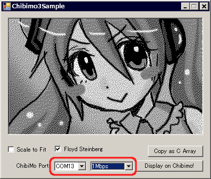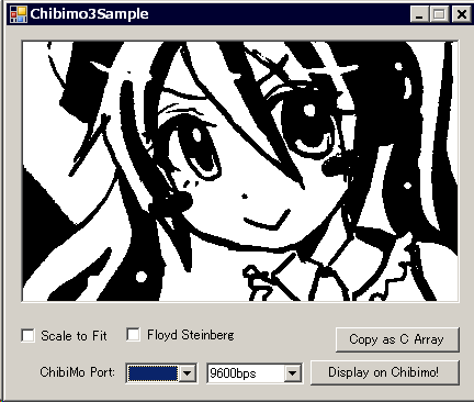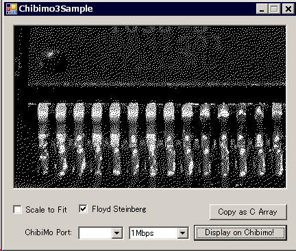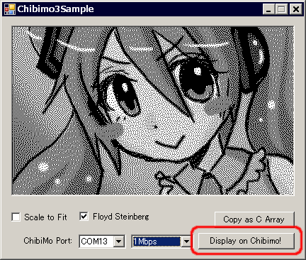 ※ USBシリアルポートの初期化の都合で、「Display on ChibiMo!」 ボタンをクリックした瞬間に、ちびモがリセットされることがあります。 この場合画像は出ませんが、動作自体は正常ですので、 何度かボタンを押してやりなおすと、画像が出ます。