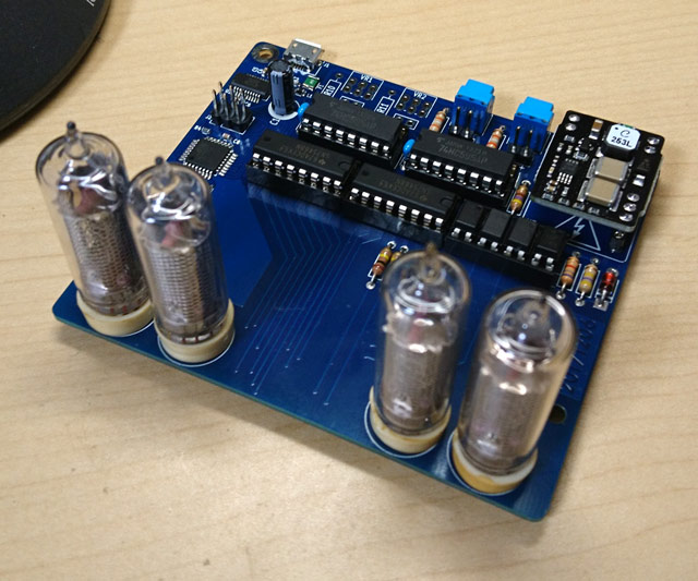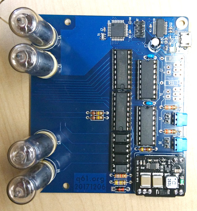 ケースへの組み込みが終わったら、PCに接続する前に、壊れてもよいUSB電源アダプターに接続します。ニキシー管が「.0. .0.」の表示になり、アナログメーターが右に振れればOKです。しばらく放置して、異常発熱、発煙、焦げた臭い等がないことを確認してください。