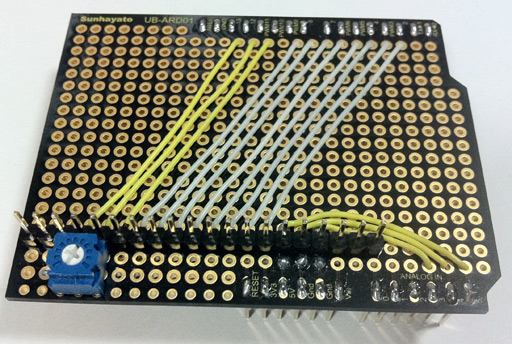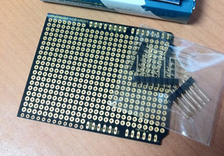 Although ChibiMo can be made just by hooking wires between Arduino and LCD, it looks just a bit nicer if wires are soldered on a shield so that they don't hang around. This one on the picture is UB-ARD01 from Sunhayato.