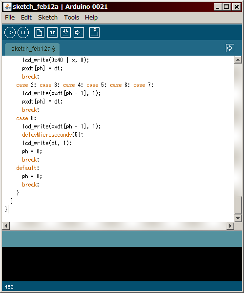 If upload is successful and your shield is correct, you will see a test pattern on the LCD. The correct pattern is shown in the picture below. Only top 8 lines are important. Lower part of the LCD may not be all-black.