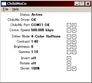 ChibiMoCo's window looks like the picture below. The first part that you should check is the "ChibiMo Port" option. Switch this option with "+" and "-" buttons until the status line reads "Active". More precisely, this option must match to the serial port number of your Arduino board.
