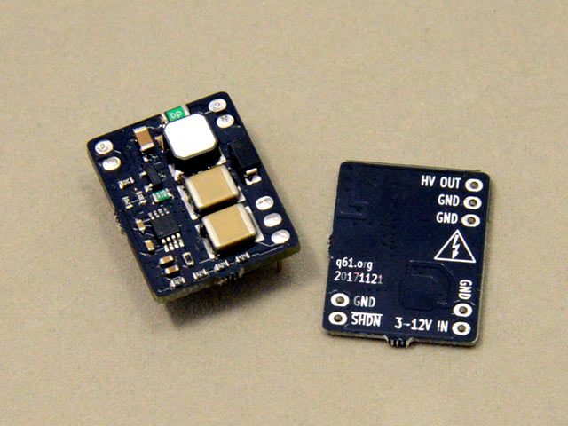 このキットはその部分を解決するもので、小さなモジュールに電源を入力するだけで、約175Vの電圧が得られます。 さらに、最低入力電圧を3.3Vとしているので、マイコン等、制御回路の電源と同じ電源から高電圧を発生できます。